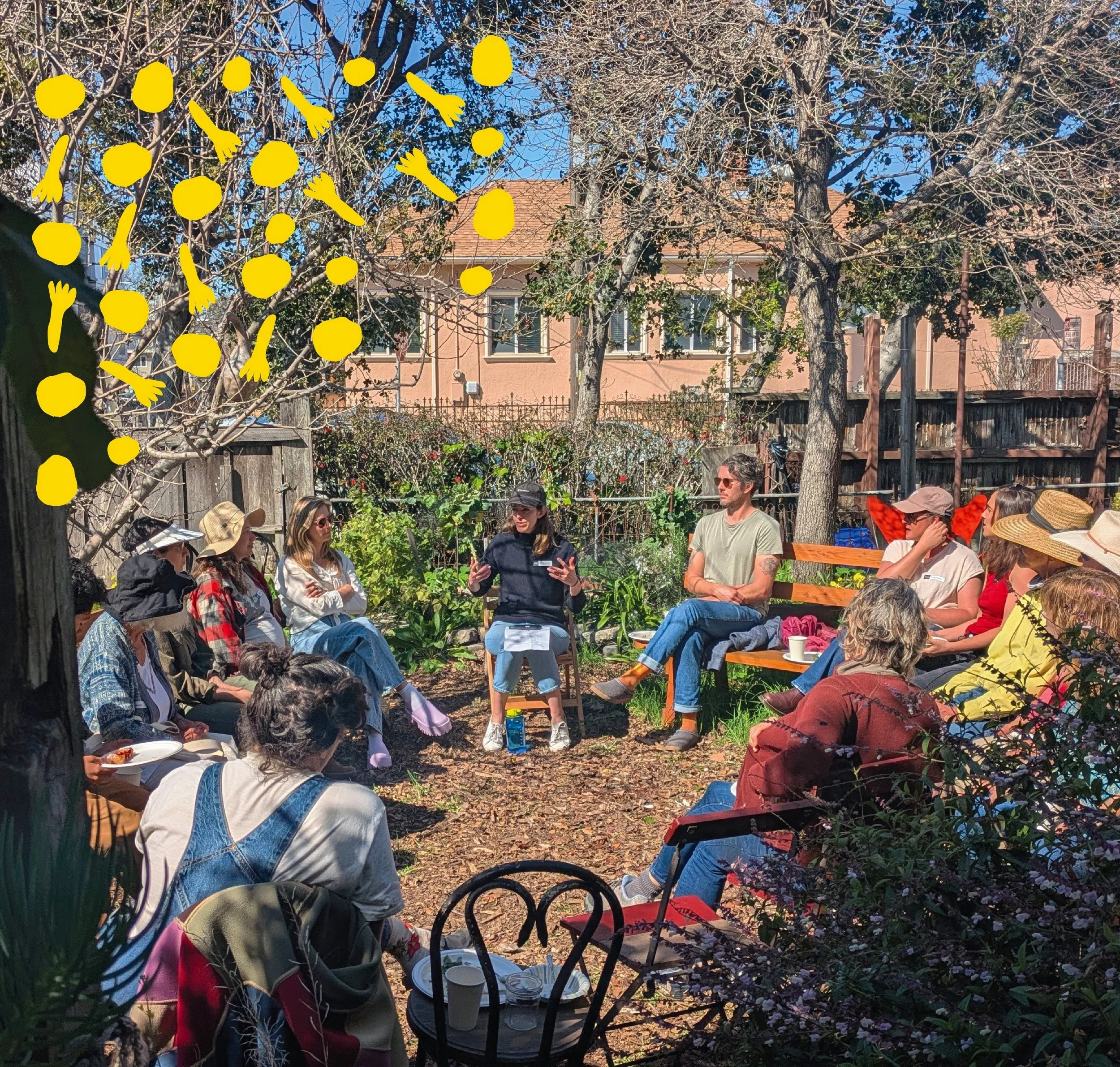 Our cornerstone event is the annual Temescal Open Edible Garden Day each summer, when participating gardens throw open their gates for a neighborhood-wide tour. Everyone—gardeners and non-gardeners alike—is invited to wander through participating gardens, discover what neighbors are growing, taste local produce, and exchange stories and skills. The event began in 2023 with nine gardens and over 70 visitors, and has since grown to welcome more than 200 visitors into over 20 Temescal gardens. It's a fantastic day to get inspired, ask questions, and see the creative ways your neighbors are growing food.